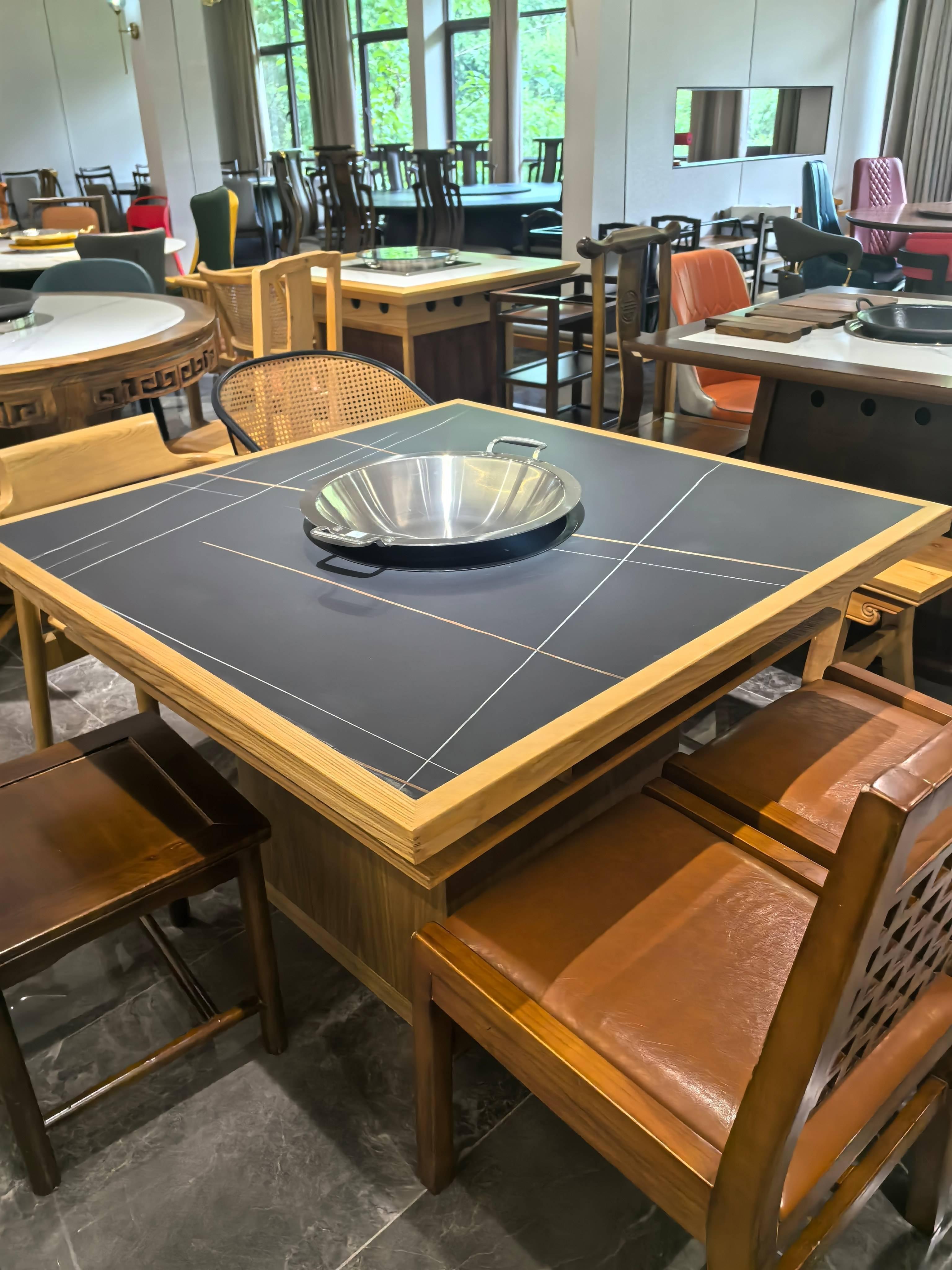 火锅桌椅(新中式,仿古)采用实木 + 大理石嵌入式电磁炉,可精准控温(多档调节),桌面承重≥80kg。使用北美白蜡木等优质实木框架,搭配天然大理石台面和环保水性漆,电磁炉有自动断电保护,边角圆润设计,还做了防水防烫处理。