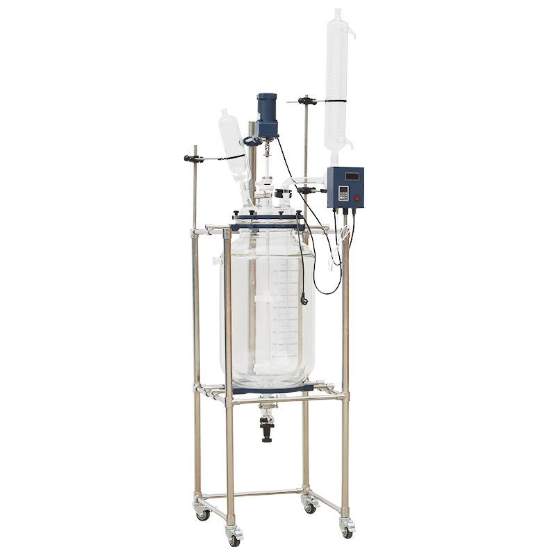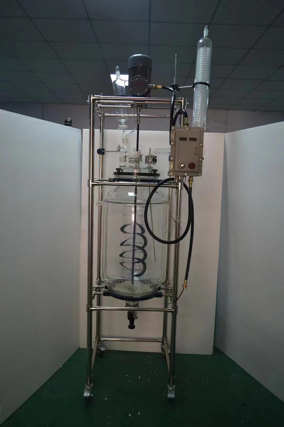 玻璃反应釜方面,与物料接触部分全部采用高硼硅玻璃(膨胀系数3.3)和聚四氟乙烯材料,性能稳定不易与物料起化学反应,使用方便安全。框架式主体,采用铝合金 + 不锈钢材质,高效稳定、美观大方、经久耐用。玻璃 + 四氟放料阀门,无积液侧放料,回收溶液十分快捷。低速增力电机,电子无极调速,通过旋扭微调,双显调速盒可数字显示转速和釜内物料温度,性能稳定、清晰显示操控及数据平面、简单易操作。搅拌系统采用双轴承、双骨架油封,耐高温、耐磨损、密封效果好。采用PT100温度传感器,304不锈钢材质,外套透明聚四氟乙烯管,双重防腐。真空压力表显示实时真空,指针显示。月牙式搅拌桨,304不锈钢 + 聚四氟乙烯搅拌叶;搅拌杆材质为304不锈钢,外包聚四氟乙烯管,强度高,耐腐蚀性强。机器底部设有带刹车的万向轮,可整体移动,操作方便。熔断器安全保护,保证电路安全运行。