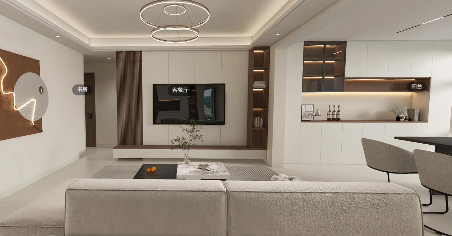 【案例一】业主李先生是曲靖一位中学语文教师,对中国传统文化情有独钟,但又担心传统中式过于厚重沉闷。他希望新家既有书卷气,又能满足年轻家人的现代生活需求。云南合四方装饰设计工程有限公司的设计师为其打造了新中式风格的装修。主色调采用柚木色(家具、墙板),点缀色为天蓝色(窗帘、单人椅、装饰画),基底色是米白色(墙面、地砖)。设计师将客厅与景观阳台打通,扩大了整体空间感。家具线条简洁流畅,摒弃了繁复雕花,以柚木色突出沉稳气质,天蓝色软装则为空间注入了灵动与跳跃感,避免了中式家具可能带来的沉闷。餐厅背景墙以简单的圆形水墨装饰画点缀,寓意“圆满”与“喜上眉梢”。卧室则根据居住者不同调整配色——主卧以灰色调营造静谧感,长辈房保留古朴典雅格调。李先生评价道:“一开始担心新中式装出来会不会像老茶馆,但合四方的设计师真的懂我!柚木色很大气,那天蓝色一搭进去,整个家都活起来了。现在每天回家,坐在客厅泡杯茶,看着阳光透过阳台照进来,感觉特别安心。朋友们来都说我家像艺术馆,特别有文化味儿,感谢合四方帮我圆了这个梦!”