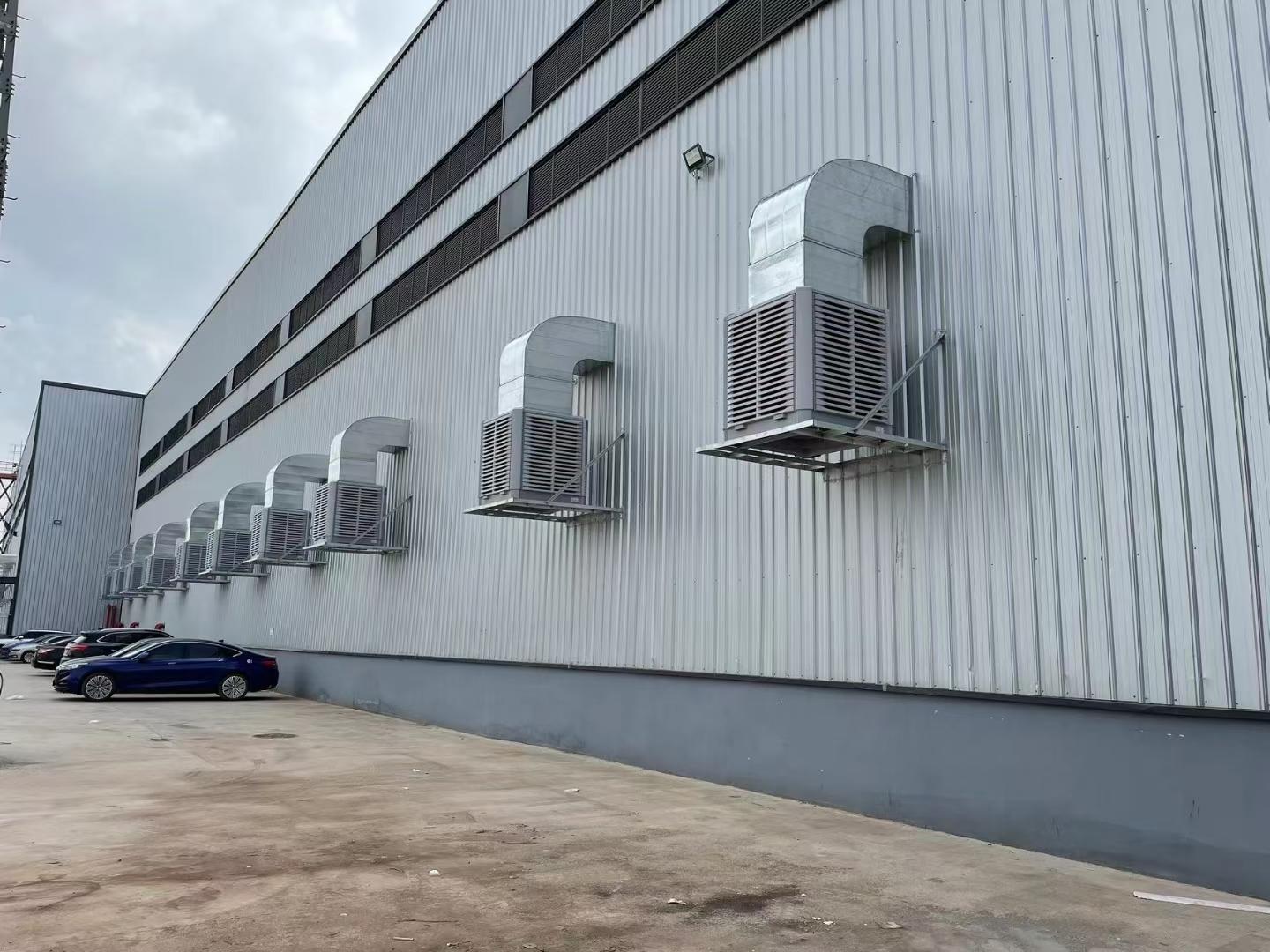 钢结构厂房通风降温方案中,通过安装环保空调(冷风机)以及工业大风扇组合,使整个车间闷热以及不通风的状况得到更大的改善,车间内温度由平均40度的环境降温到30度,员工的工作效率大大的提高,整体工作环境清凉舒适,车间的气味得以排出。