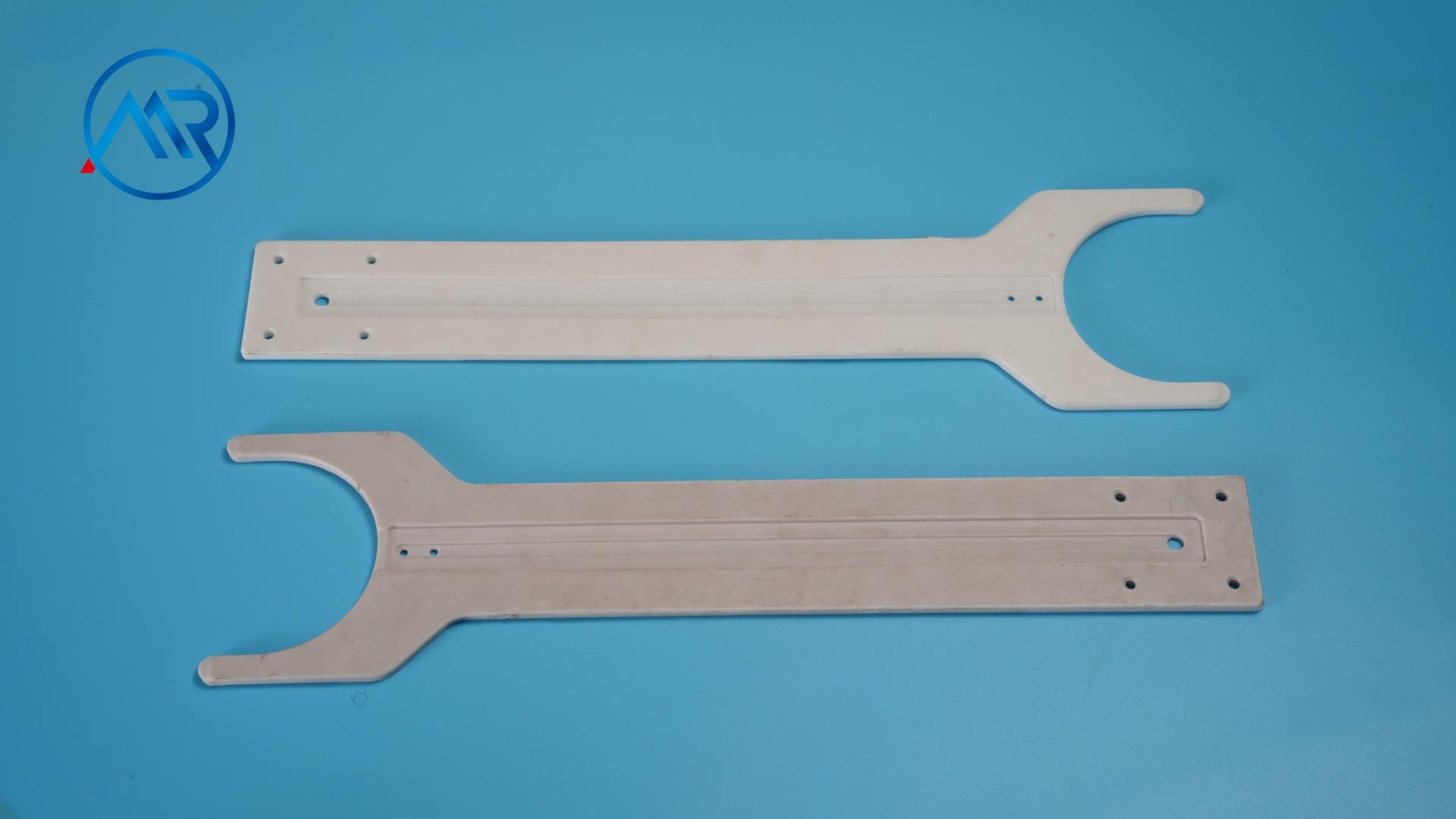 陶瓷手臂采用高纯度氧化铝或氧化锆原料,经过等静压成型、高温烧结、精密加工而成。它具有耐高温、耐腐蚀、耐绝缘等性能,可长期在高温真空以及腐蚀性环境下使用,尺寸精度可达±0.001,光洁度可达Ra0.1,使用温度高达1500℃,在各种半导体生成设备中起到搬运物料的作用。