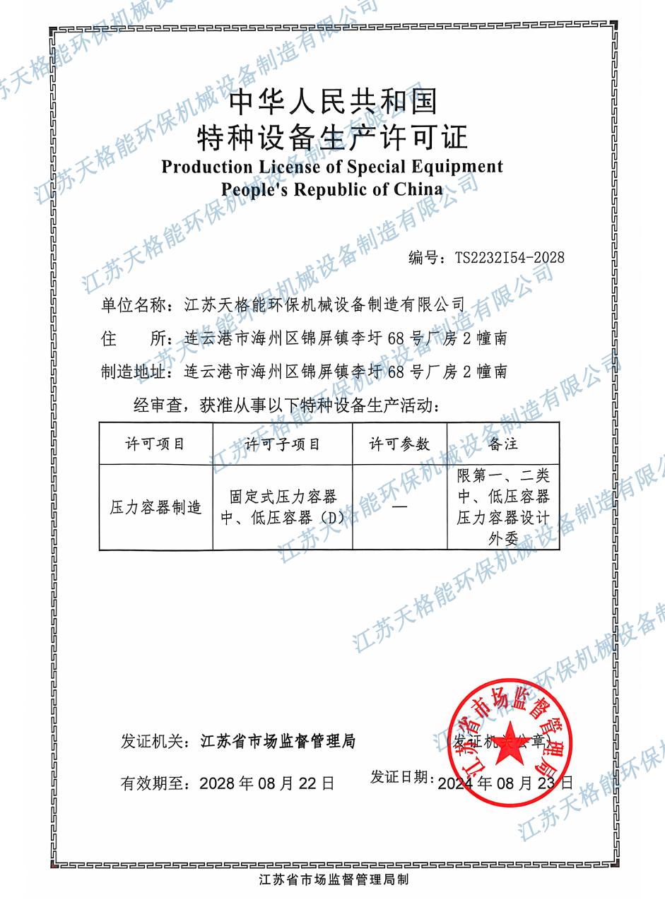 在企业****方面,江苏天格能环保机械设备制造有限公司荣获高新技术企业证书,拥有质量管理体系认证证书(GB/T19001 - 2016/IS09001:2015),以及压力容器制造 - 特种设备生产许可证等。此外,公司还拥有多项实用新型专利,如一种消音器结构、一种微穿孔消声器、一种全自动反冲洗石英砂过滤器、一种螺旋煤粉取样器、一种除氧器水封装置、一种带压缩空气吹扫功能的风机消声器等,这些专利技术体现了公司在技术研发方面的实力。