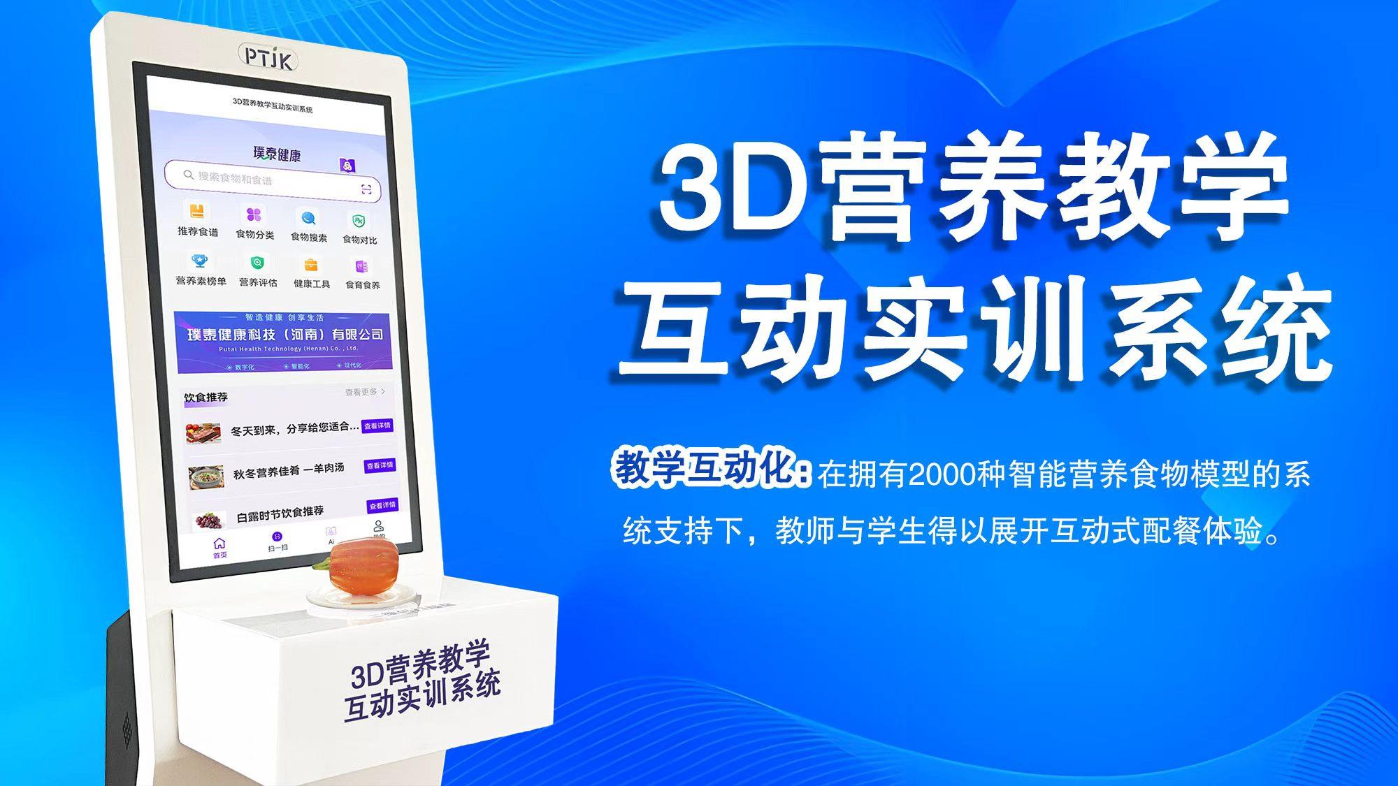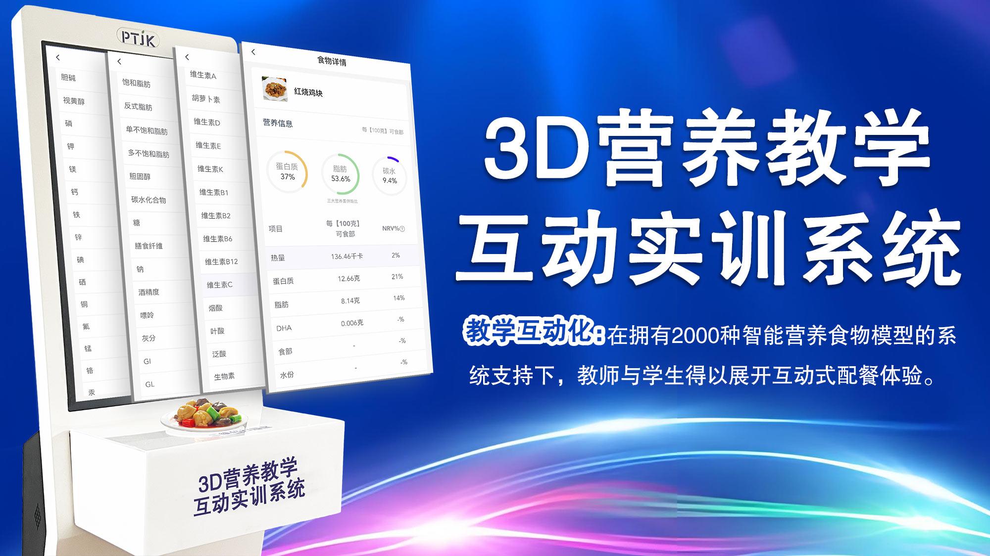 其旗舰产品3D营养教学互动实训系统打造了深度交互的智慧实训环境。系统由后台数据中心、前台应用软件、一台32寸营养分析终端大屏以及80个(可扩展)智能电子食物模型共同组成。