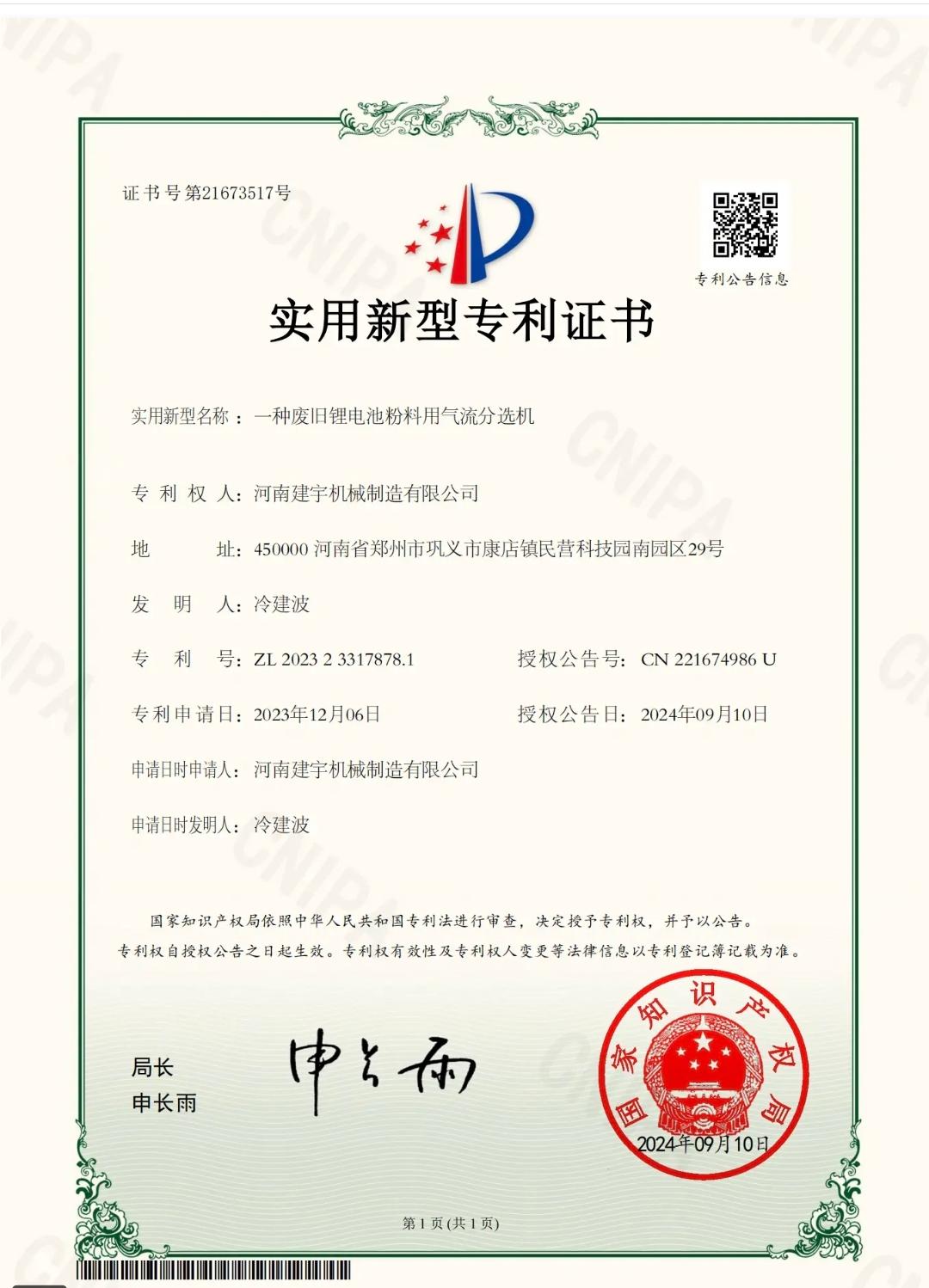 建宇机械还获得了众多**与行业认可。公司为省级科技型企业,服务多家《新能源汽车废旧动力蓄电池综合利用行业规范条件》白名单企业。通过ISO9001/ISO14001/ISO45001及知识产权管理体系认证,累计获得授权专利30项,其中“锂电池安全破碎与高效分选技术”获中国有色金属工业科技奖。产品符合《废锂离子电池处理污染控制技术规范》,通过防爆认证(Ex)、环保检测,已服务铁阳集团、韩国三星,LG等行业企业,项目验收一次通过率100%。