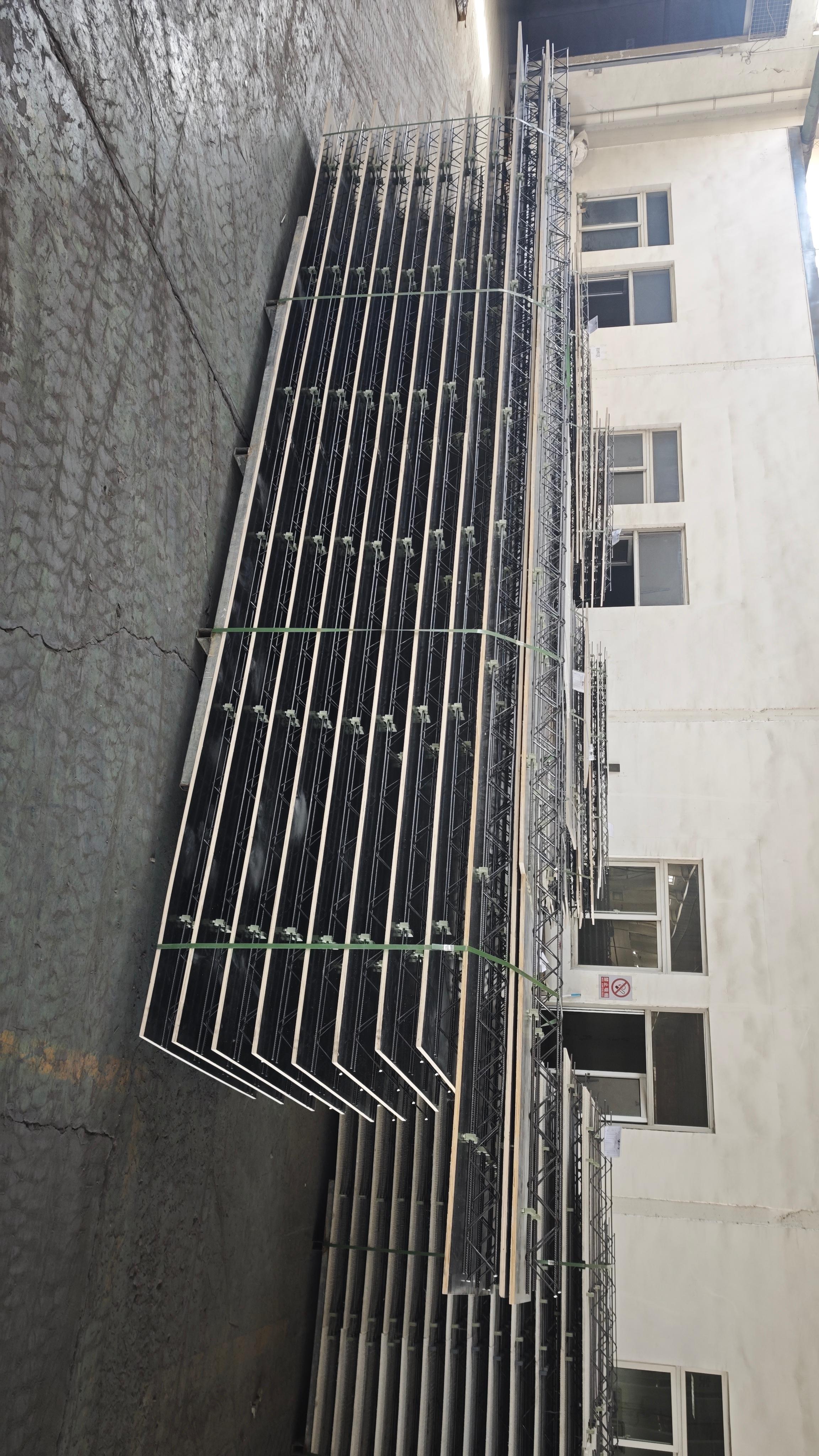 可拆卸楼承板的底模可采用塑料模板、竹胶板或胶合木模板等,规格、厚度可定制。经技术人员图纸深化后切割,出厂即可使用,无需工地二次加工,节省了现场钢筋绑扎工作量,符合装配率要求,拆模后成型效果好,是住宅项目较好的装配式预制构件之一。