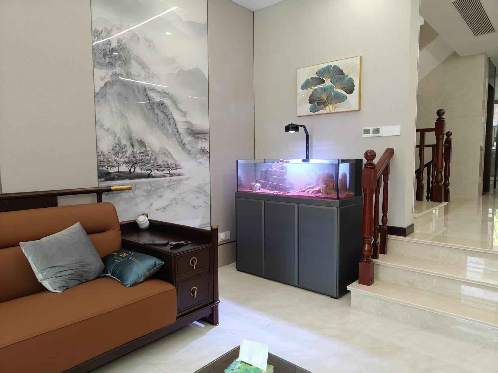 六如家居鱼缸的价值核心是以水景为媒介,融合实用功能、空间装饰与情绪疗愈,实现“功能适配+美学赋能+情感滋养”的三维价值统一。它能够适配不同家居风格,如现代简约、新中式、轻奢等,缸体造型、材质与家居软装相呼应,可作为玄关、客厅、书房的视觉焦点。同时,通过造景,如使用水草、山石、沉木等,打造个性化水景,将自然水景融入居家空间,弥补城市居住的“自然缺失”,实现空间的层次感与艺术感提升。