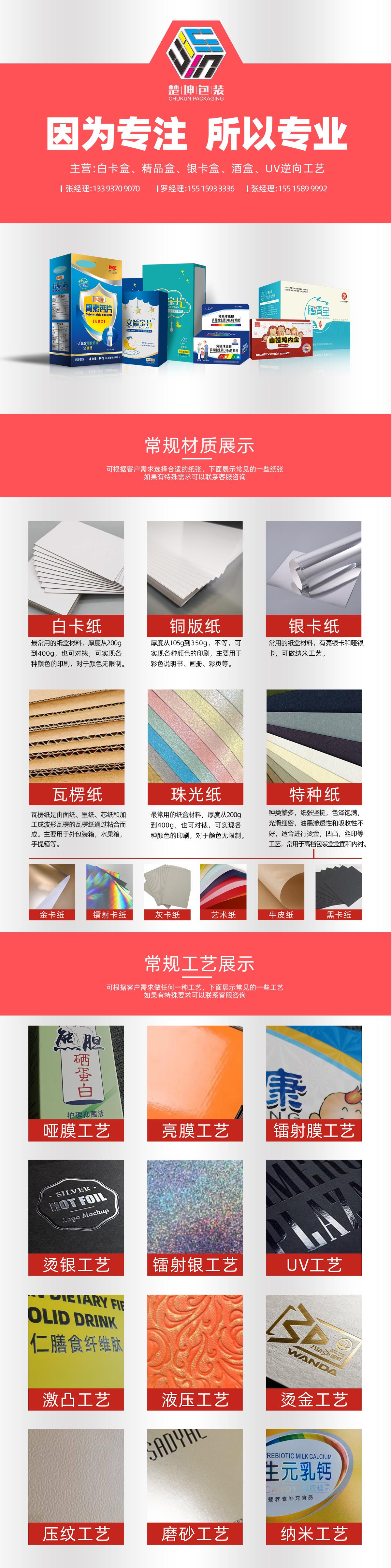 郑州楚坤商贸有限公司服务于医药、保健品、功能性食品、滋补品、化妆品等细分领域,致力于通过专业的包装解决方案提升品牌价值、确保产品合规并优化消费者体验。公司拥有一支专业的团队,从包装设计到生产制作,每一个环节都严格把控,力求为客户提供*优质的包装产品。
