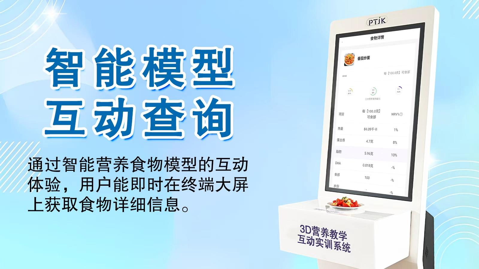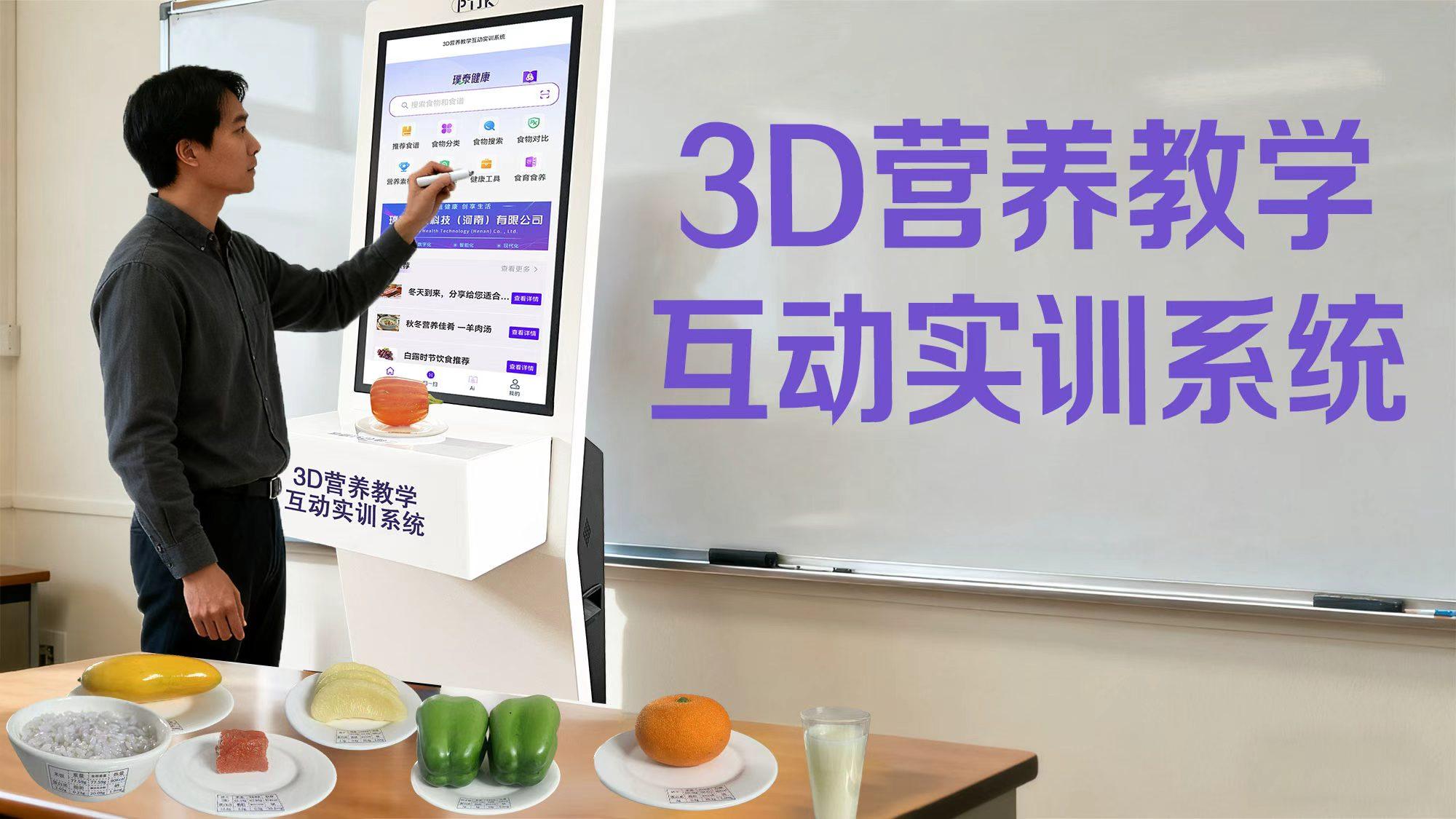 其旗舰产品3D营养教学互动实训系统打造了深度交互的智慧实训环境。系统由后台数据中心、前台应用软件、一台32寸营养分析终端大屏以及80个(可扩展)智能电子食物模型组成。
