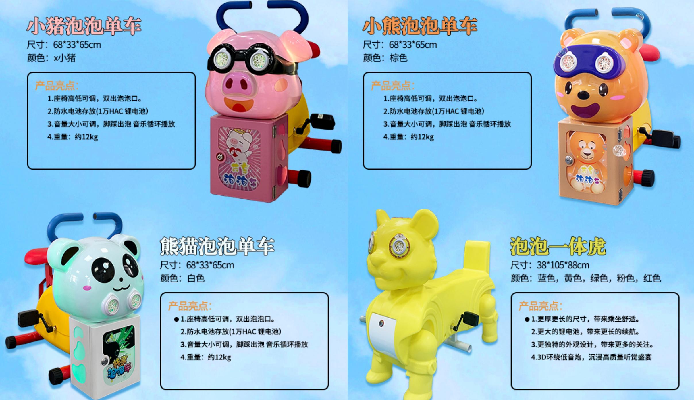 共享儿童单车扫码脚踏泡泡车也是该公司的创新产品之一。它采用扫码租借的方式,方便家长和孩子使用。孩子们在骑行单车的过程中,还能体验到泡泡车产生泡泡的乐趣。这种产品既满足了孩子们的游乐需求,又符合当下共享经济的发展趋势。而且单车的质量和安全性经过严格把关,配备了相应的安全防护设施,保障孩子们的骑行安全。