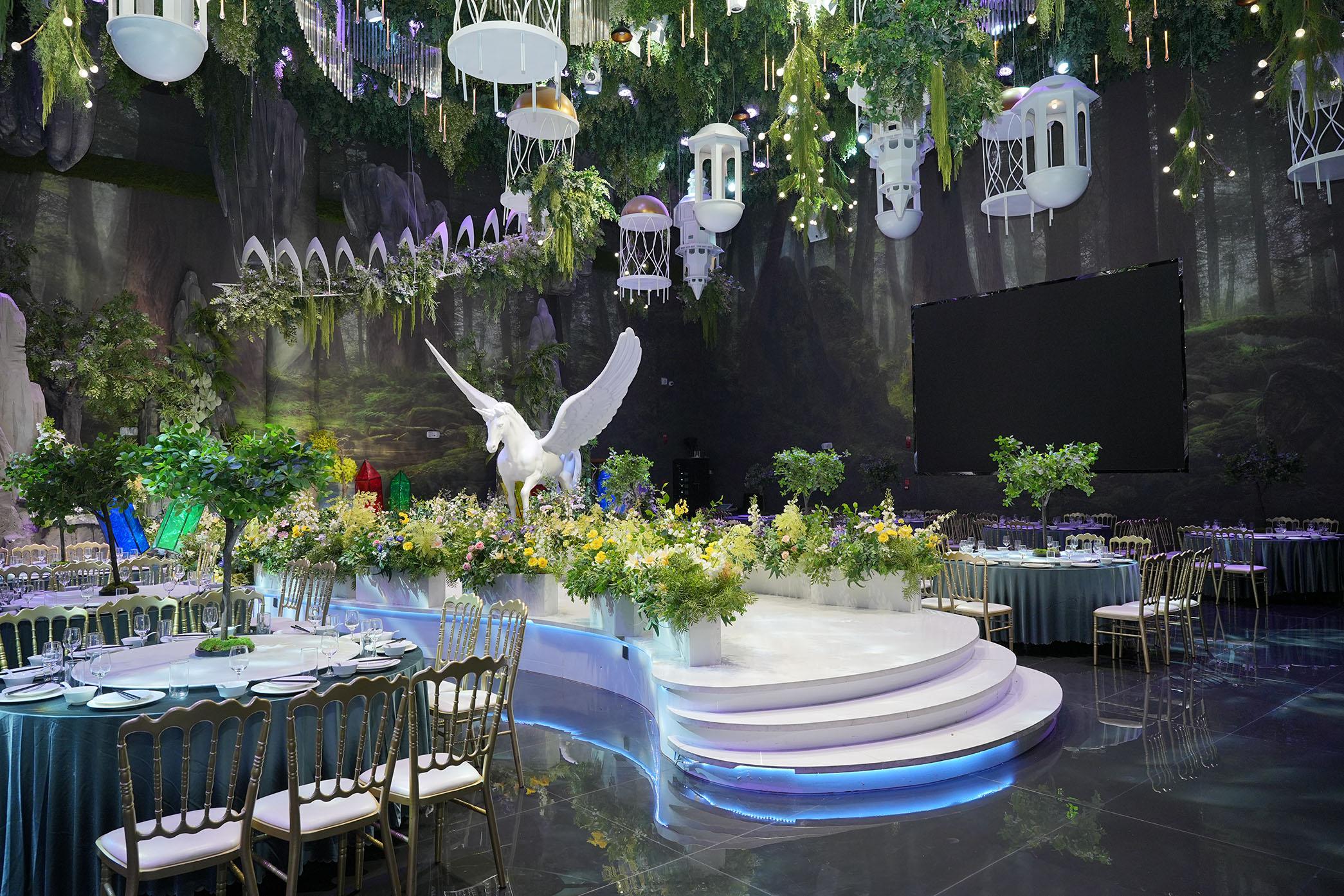 该中心集沉浸式主题婚礼堂、商务宴请、家庭聚会及全案庆典策划于一体,以“一站式礼宴解决方案”重新定义西北地区的宴会体验。这里拥有从4人私密包厢到35桌盛大宴会厅的多元化空间矩阵。其中,奥斯卡厅以11米挑高刷新区域宴会厅高度记录;云中长安厅、伊甸园厅等均采用9.9米层高,寓意“长长久久”。而且,其不仅承接婚宴,还广泛服务于寿宴、宝宝宴、升学宴、公司团建及商务接待,实现“一厅多用,灵活百变”。
