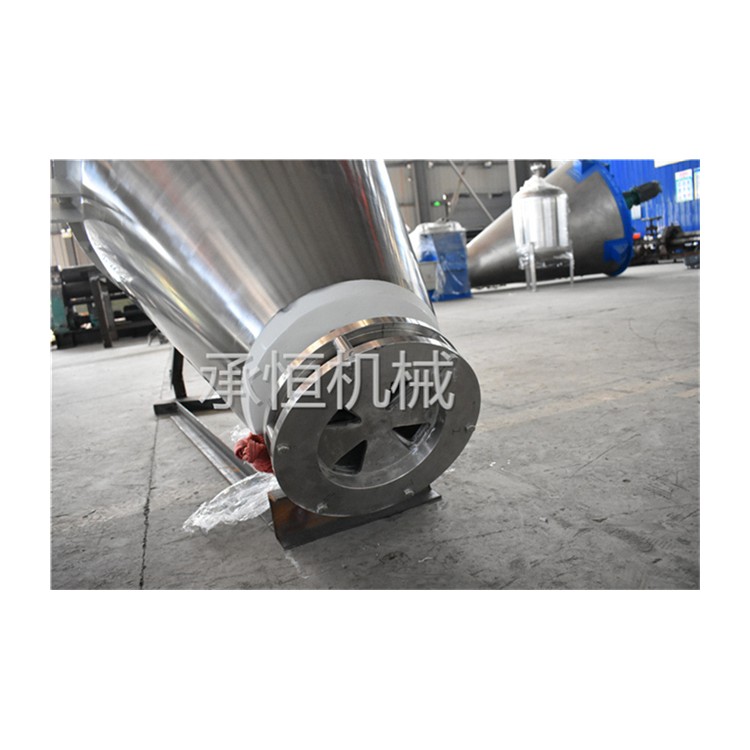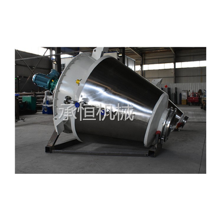 双螺旋锥形混合机(双螺旋混合机)的搅拌部件为两条不对称悬臂(转臂);不同长度,它们环绕锥形容器的轴线转动(公转)的同时,还借助转臂下方两根螺旋做自转运动; 该设备通过悬臂与螺旋的公、自转使物料反复提升实现混合目的。