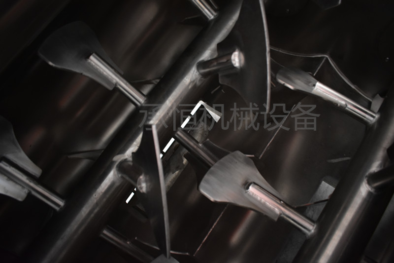 工作原理: 该产品多种物料的混合,特别是搅拌比重或粒径相差悬殊的物料有较好混合效果;该设备在孪生的U形筒体内分布两排不同转向的叶片,工作时物料径向、环向、轴向三向抛洒运动,形成交叉循环、剪切掺混等多重效果,在极短的时间内达到均匀混合,混合效率高、能耗低、污染小。该机混合速度高,批次混合一般 2~3min, 特别适应与流水线的生产使用。