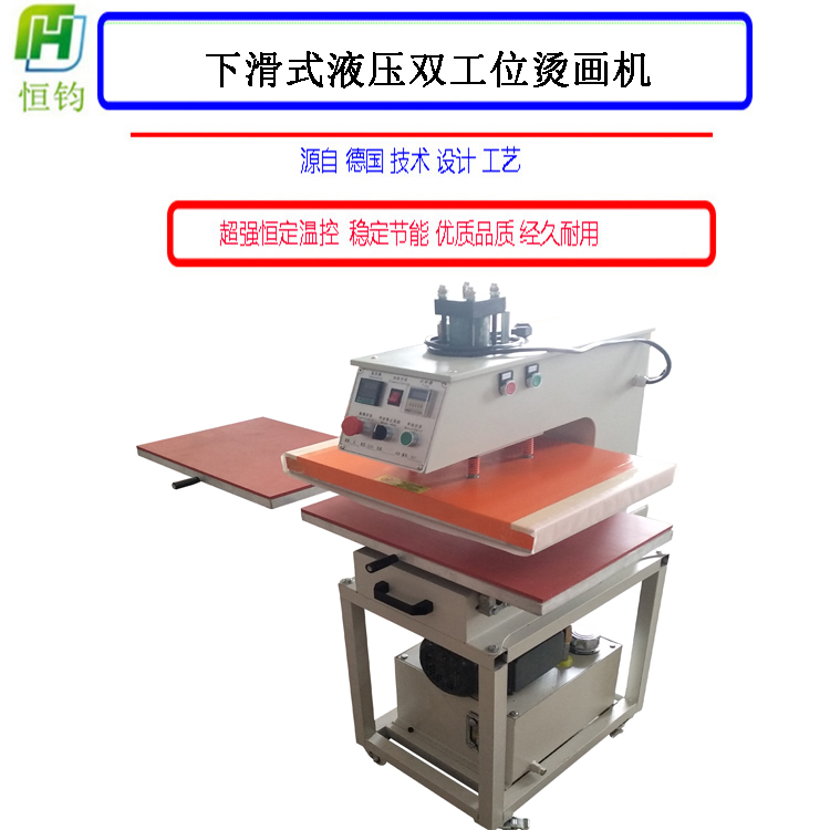 液压双工位烫画机可将升华类、溶剂类油墨的彩色图案与文字经热转印在棉、麻、化纤、尼龙等织物及陶瓷制品上,还可进行植毛烫画和发泡印花工艺等的热处理,及服装的低温低压衬与面料的粘合,如服装、鞋帽等粘合之用,也可用于生产小批量的手帕