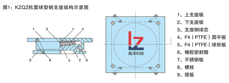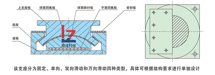 抗震球型钢支座主要由下座板、上座板、球型钢衬板、滑移装置、弹性减震件、不锈钢板和聚四氟乙烯板等组成。包括固定支座、单向活动支座、双向活动支座三种型式,支座规格分为22个等级,支座竖向设计承载力、设计转角、摩擦系数均按相关标准要求设计。其用钢量少体积小,制造成本相对较低,具有万向转动万向承载等其它类型支座所无法比拟的有点,而且采用抗拉、抗剪的特殊结构,具有能抗地震烈度9度的能力。抗震球型钢支座适用于大跨度空间结构及大跨度桥,特别适用于宽桥、曲线桥、斜桥、尤其适用于高烈度地震区的工程结构。我公司生产的该系列产品已分别在冶金部建筑研究总院工程结构试验室、石家庄铁道学院工程结构检测中心、上海同济建设工程质量检测站、广州大学工程抗震研究中心检测合格。