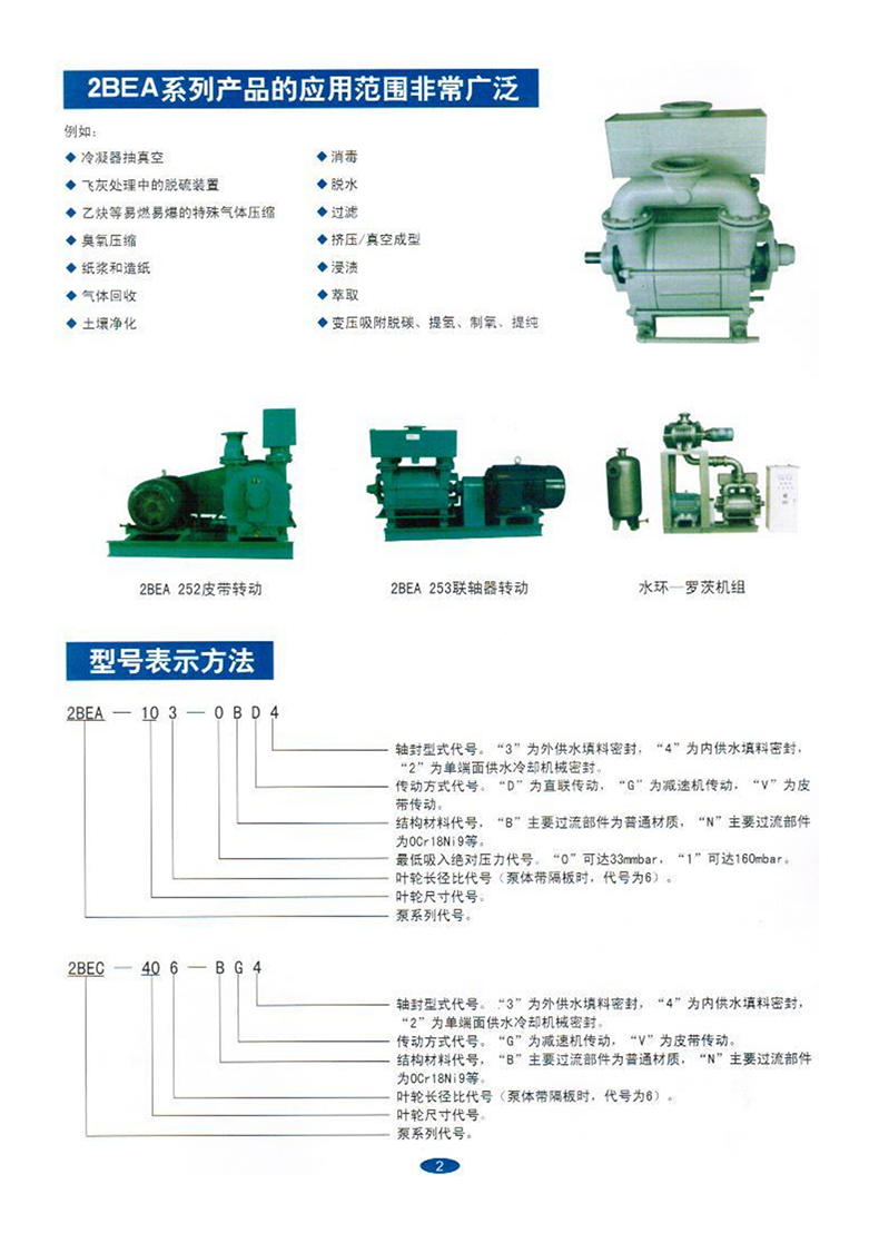 本公司研发产品的2BE型水环式真空泵及压缩机,是我公司在多年科研成果和生产经验的基础上,结合国际同类产品先进技术,研制开发的高 效节能产品通常用于抽吸不含固体颗粒,不溶于水,无腐蚀性的气体,以便在密闭容器中形成真空和压力。通过改变结果材料,亦可用于抽吸腐蚀气体或以腐蚀性液体做工作液。2BE型水环式真空泵广泛用于造纸、化工、石化、轻工、食品、冶金、建材、石器、洗煤、选矿、化肥等行业。