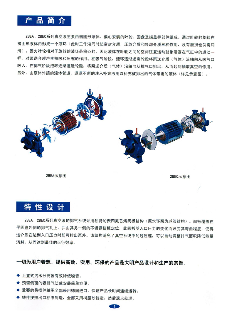 1、轴承全 部采用原装进口轴承,保证了2BE型水环式真空泵的叶轮精 确定位及运转过程中的高稳定性。