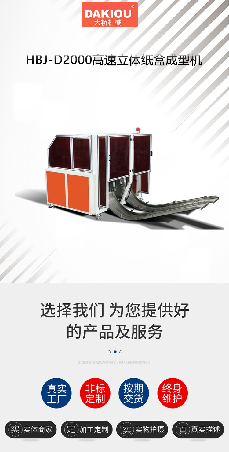 HBJ-D2000是我公司采用借鉴进口设备品质,自主创新的一款生产汉堡盒、打包盒、蛋糕盒、五金盒等立体纸盒成型机。本机采用微电脑控制、PLC、交流变频、真空吸纸、自动上胶、加热一体,实现了送纸顺畅、定位准确、收料整齐。设备所有关键部位及控制系统采用进口产品,保证了设备运行时定位准确、运行平稳、安全可靠。