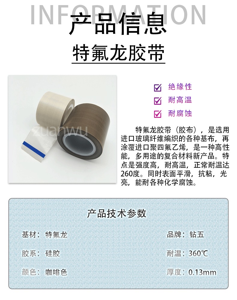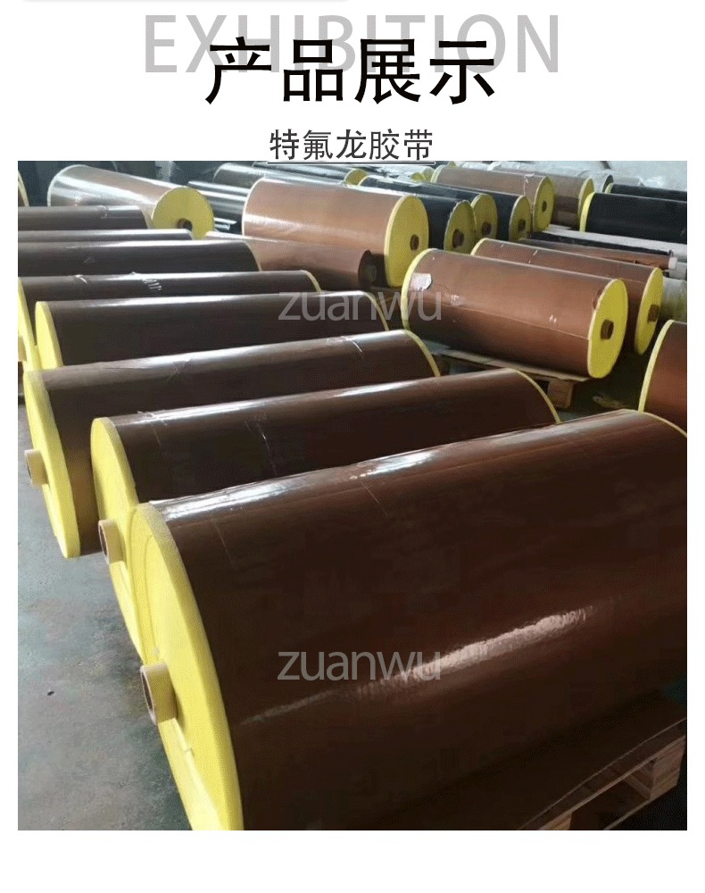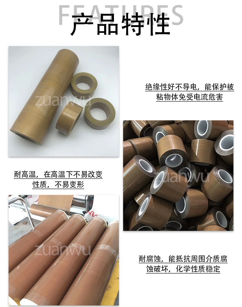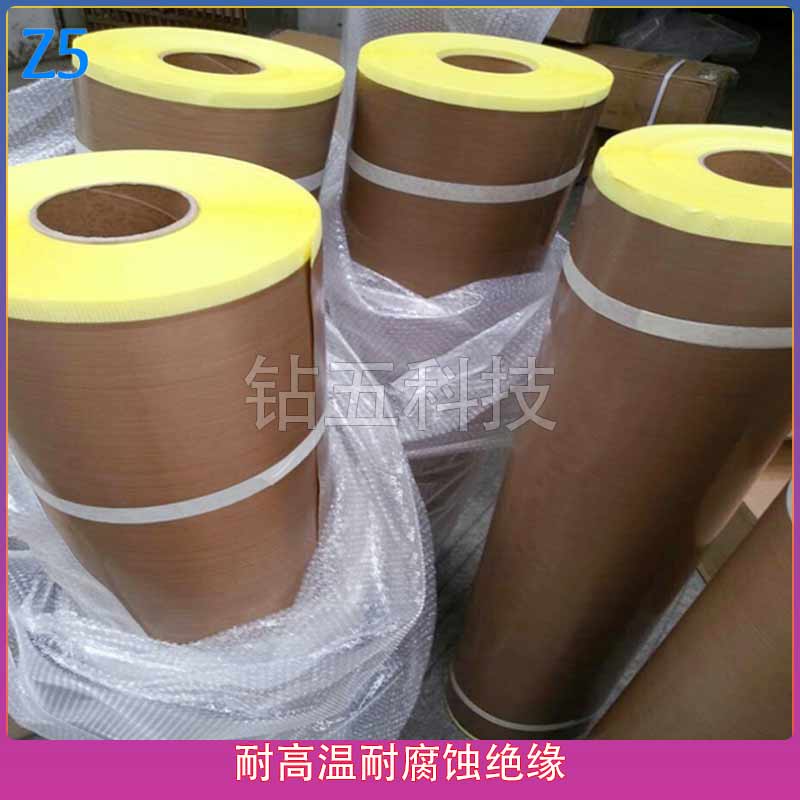 简 述:特氟龙胶带(胶布),是选用进口玻璃纤维编织的各种基布,再涂覆进口聚四氟乙烯,是一种高性能,多用途的复合材料新产品。特点是强度高,耐高温,正常耐温达260度。同时表面平滑,抗粘,光亮,能耐各种化学腐蚀。