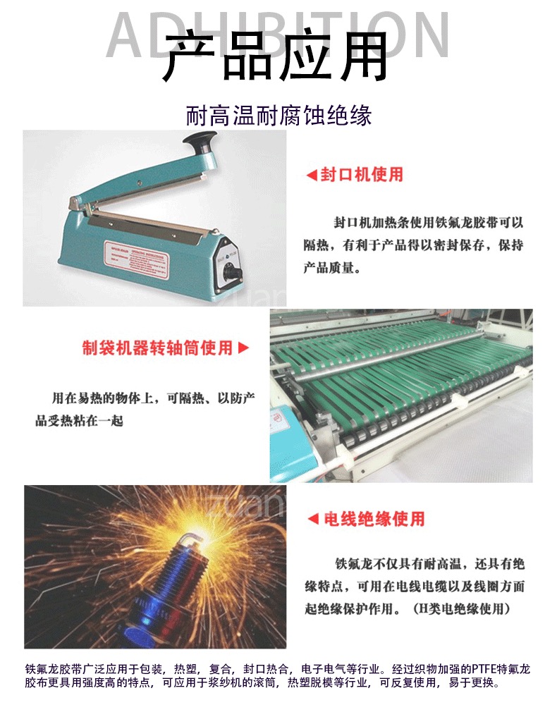 应 用:电绝缘件绝缘保护,防粘热合特氟龙,耐腐蚀铁氟龙胶带,电容器铁氟龙胶带,电子产品铁氟龙胶带,抗化学性铁氟龙胶带,深井特氟龙胶带,电容器特氟龙胶带,防粘热合铁氟龙胶带,特氟龙网带,特氟龙皮带。