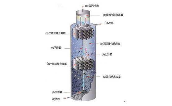 UASB反应器废水被尽可能均匀的引入反应器的底部,污水向上通过包含颗粒污泥或絮状污泥的污泥床。厌氧反应发生在废水和污泥颗粒接触的过程。在厌氧状态下产生的沼气(要是甲烷和二氧化碳)引起了内部的循环,这对于颗粒污泥的形成和维持有利。在污泥层形成的一些气体附着在污泥颗粒上,附着和没有附着的气体向反应器顶部上升。上升到表面的污泥撞击三相反应器气体发射器的底部,引起附着气泡的污泥絮体脱气。气泡释放后污泥颗粒将沉淀到污泥床的表面,附着和没有附着的气体被收集到反应器顶部的三相分离器的集气室。