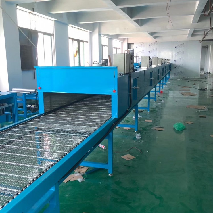 隧道烘干线该设备是一台隧道式链条网带通过式烘干设备,采用特制链条传动输送工件,具有烘干、等功能的新颖连续式烘干设备。由人工将工件放在传动链条网带上,依次通过烘干后出料。上罩内的雾气经吸雾风机抽出后外排出到总排气管道中去。该机具,功能全,结构合理,操作方便,烘干效果好的优点,这对于大批量烘干、改善劳动环境,提高质量,具有重要的意义。机身结构采用密封式,外型美观,设备拆卸检修方便。