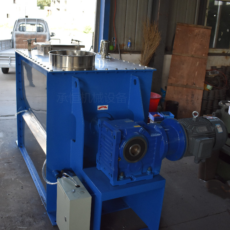 卧式螺带混合机以有效率、快速混合物料,在搅拌轴的螺旋带运动下使内外螺旋带在较大范围内翻动物料,内螺旋带将物料向内侧运动,外螺旋带将物料由两侧内向运动,使物料来回掺混,另部分物料被螺旋带推动下,沿轴向径向运动,从而形成对流循环。由于上述运动的搅拌,物料在较短时间内获得快速均匀混合。