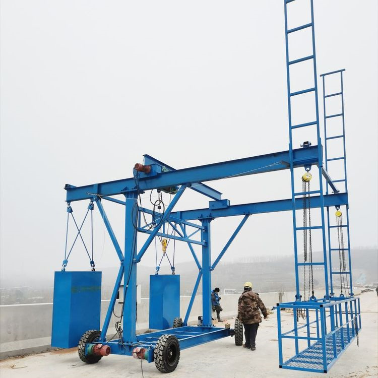 由可转向行走车体(前桥转向系统、后桥驱动系统、行走底盘等)、支架、稳定架、横梁、定距杆、行车梁、滑动架、滑轮支架、钢丝吊绳、钢丝电动葫芦、手拉葫芦、电气控制箱及遥控器、配重吊块等组成。