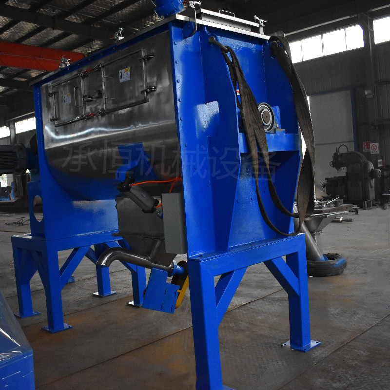本系列混合机以强烈、有效率混合为特点、卧式筒体内两根搅拌等速反向旋转,上特殊布置的桨叶确保物料径向、环向、轴向三向运动,形成复合循环,在短的时间内达到均匀混合。