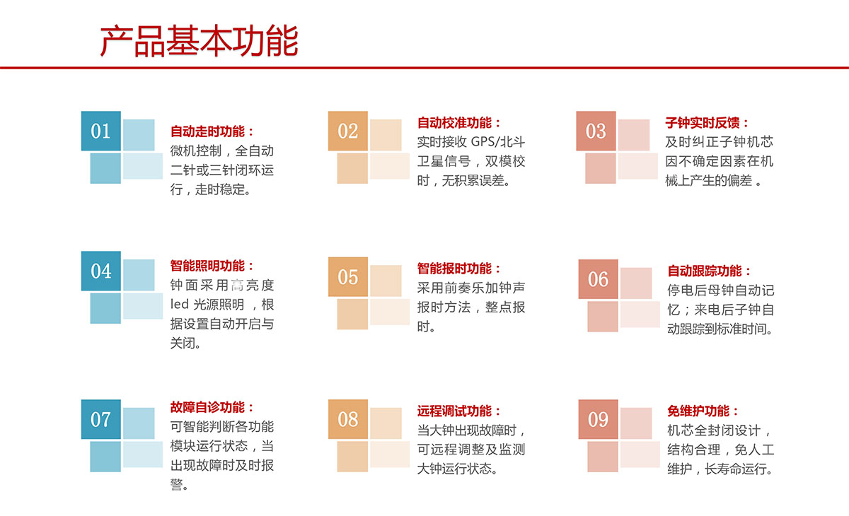 塔钟是机电一体化的整体设备,子母钟系统全自动化运行,系统由三大件 组成:母钟智能控制系统、机芯运转系统和子钟整体外观,可实现二针或三针的精准走时。我司的三大件都是自主研发设计生产,拥有原程序,拥有实用新型技术、外观设计、软件著作权等多项专利,可以根据客户要求定制,并可实现 与其他系统互联互通。