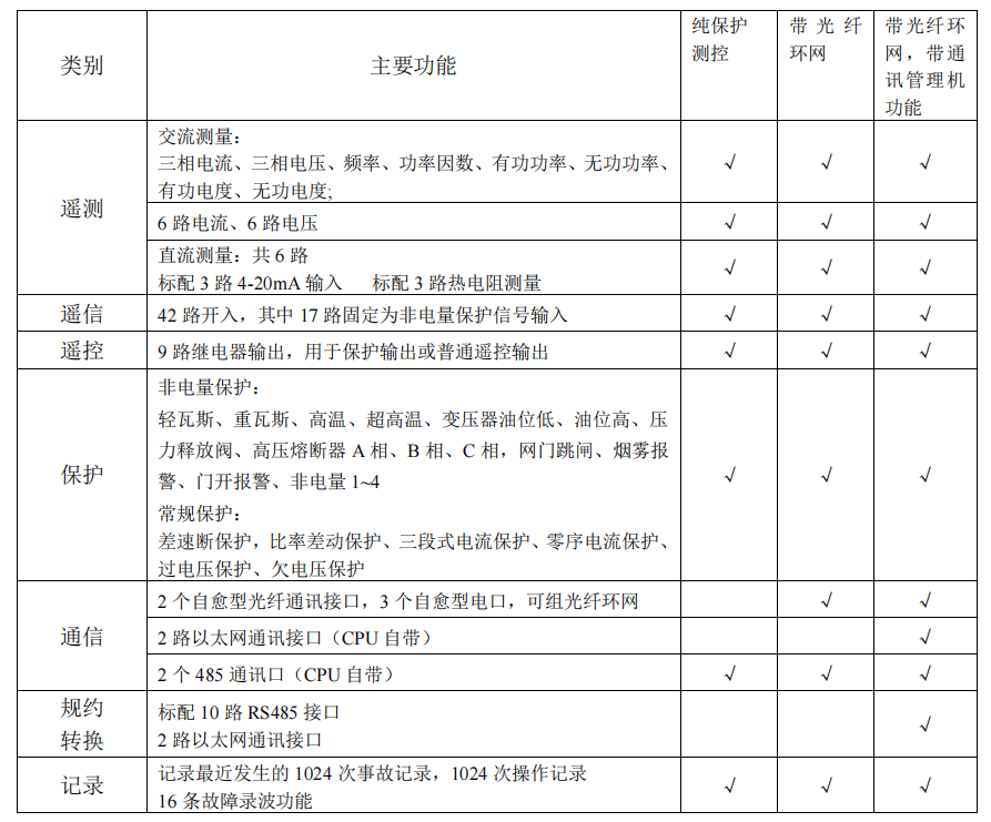 增强对变压器的保护功能 本装置集成了变压器继电保护的功能:差动保护,非电量保护,三段式过流保护、零序电流保护、 过电压及低电压保护等,其保护功能可以通过定值控制字投退,方便用户选择使用。