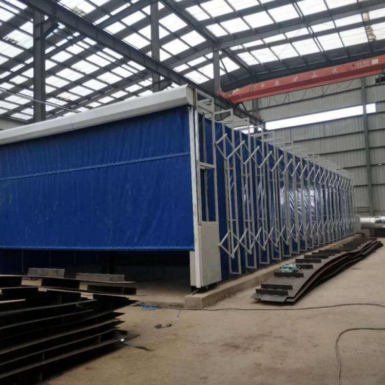 喷漆房后部采用防火岩棉夹芯板(可更换为镀锌板制作)作为底板,并合理设置多个吸风口,喷漆房内漆雾能有效进入后道废气处理装置。伸缩式喷漆房采用活动式框架结构,内衬玻璃纤维防火篷布,通过进出口门头处的驱动电机,通过轨道带动整体结构进行伸缩运动;非工作时间可将喷漆房整体折叠,节省了车间场地,作业时根据实际情况调节入口处卷帘,控制补风,从而提高作业时产生漆雾的回收效果。