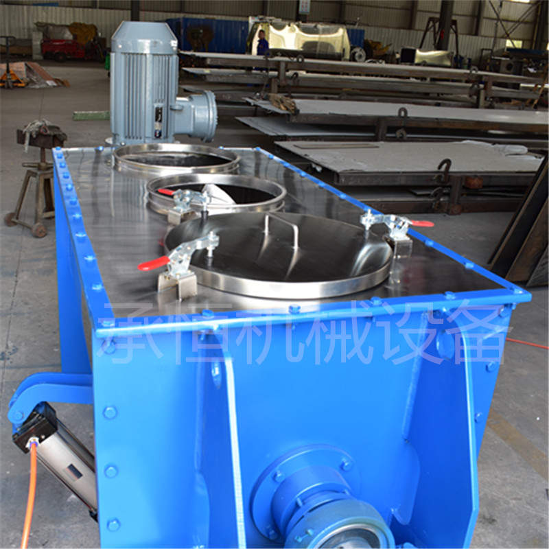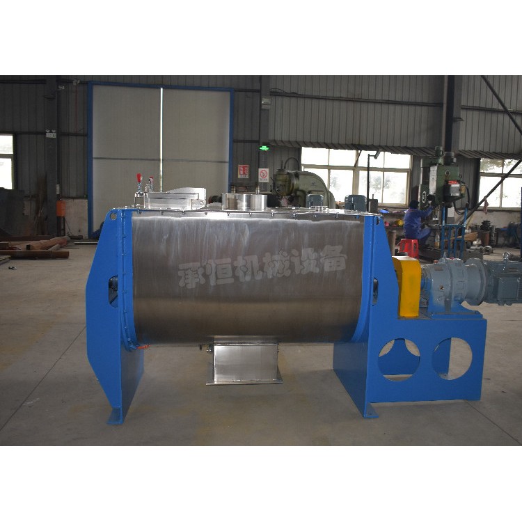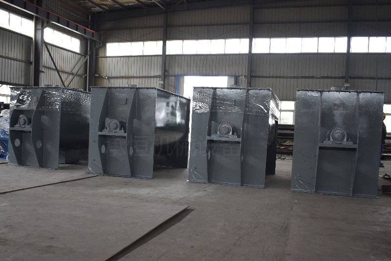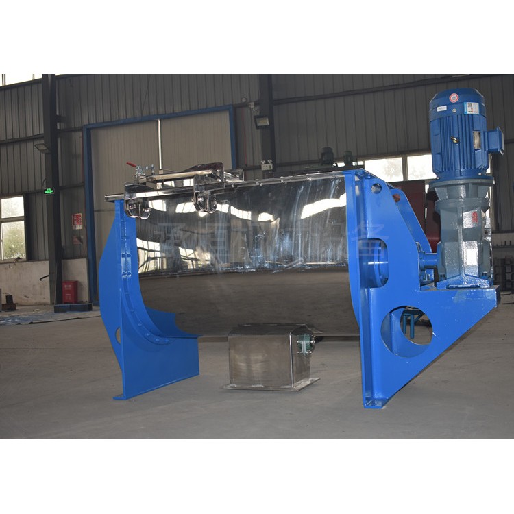 卧式混合机工作原理筒体内装有双轴旋转反向的浆叶,浆叶成一定角度将物料沿轴向、径向循环翻搅,使物料迅速混合均匀卧式混合机性能特点减速机带动轴的旋转速度与桨叶的结构会使物料重力减弱,随着重力的缺乏,各物料存在颗粒大小、比重悬殊的差异在混合过程中被忽略。激烈的搅拌运动缩短了一次混合的时间,更快速。 即使物料有比重、粒径的差异,在交错布置的搅拌叶片快速剧烈的翻腾抛洒下,也能达到很好的混合效果。