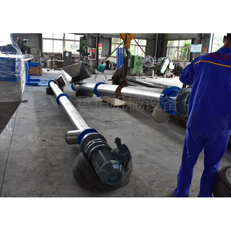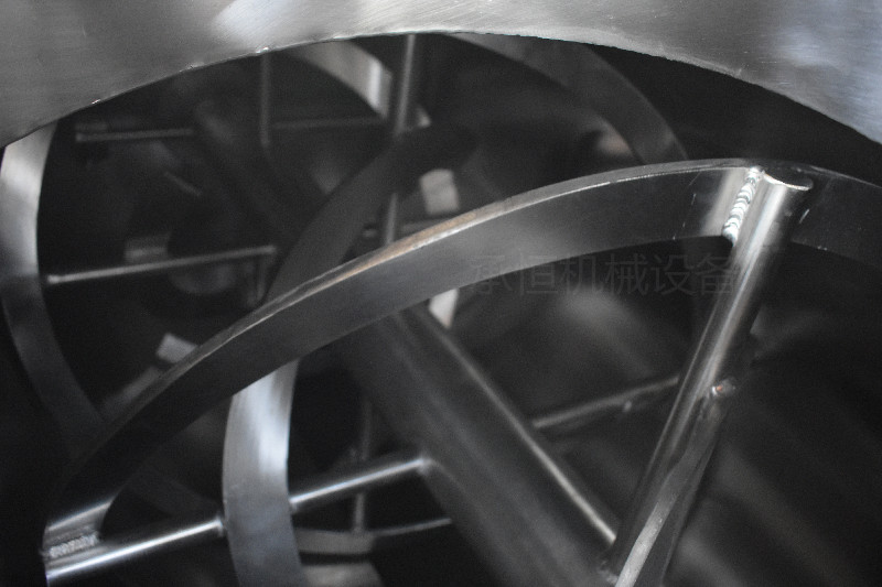 混合机筒内的两只非对称螺旋的快速自转将物料向上提升,形成两股非对称沿筒壁自下向上的螺柱形物料流,转臂带动的螺旋公转运动,使螺旋外的物料不同程度进入螺柱包络线内,一部分物料被错位提升,另一部分物料被抛出螺柱,从而达到合圆周方位物料的不断更新扩散,被提到上部的两股物料再向中心凹穴汇合,形成一股向下的物料流,补兖了底部的空穴,从而形成对流循环。由于上述运动的复合,物料在短时间内获得了均匀混合,混合度较高。