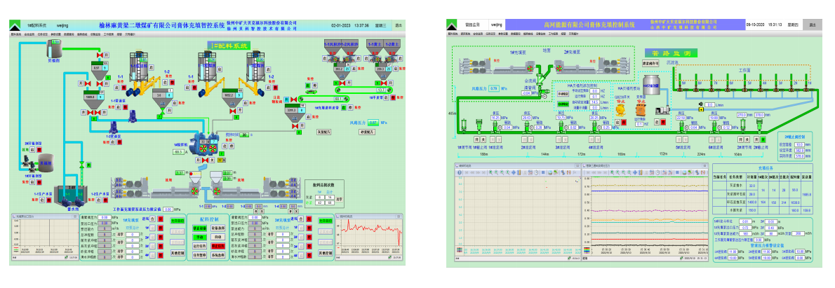 人机界面(HMI)的开发由WINCC7.4(Windows ControlCenter)实现,画面美观、直 观,色系采用标准人机界面规范,包含有:配比搅拌+泵送系统界面、管阀监测监控界面、矸石破碎筛分界面、配方下载界面、历史记录及状态曲线查询等。