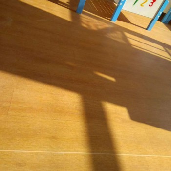 2.幼儿园室内专用PVC地板100%纯PVC耐磨层,厚度达1.5mm,并经防老化和紧固技术处理,耐磨耐压,使用寿命可达5—10年。