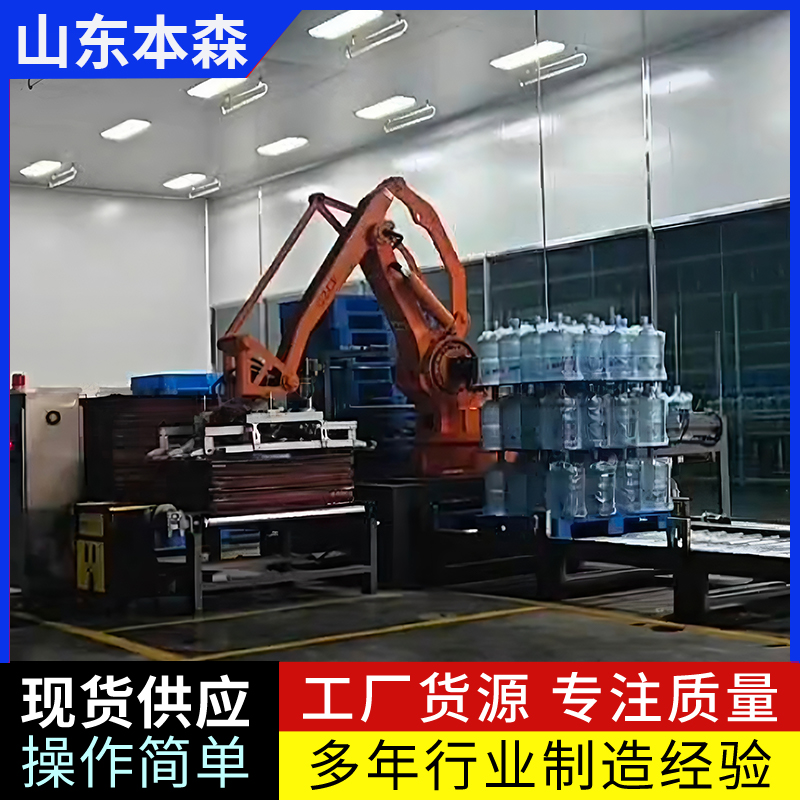 大桶水生产线全自动码垛机器人是现代水处理及包装行业实现自动化生产的关键设备之一,其通过集成机械、电子、控制及人工智能技术,能够高效、精准地完成大桶水(如5加仑、3加仑等规格)的码垛作业,显著提升生产效率并降低人力成本。以下从技术特点、应用优势及发展趋势三方面展开分析: