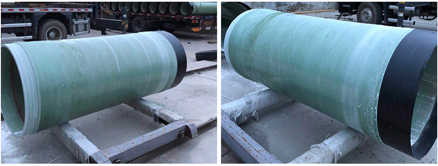 采用12米长定长缠绕玻璃钢夹砂管生产工艺,在每根模具上一次生产出4段3米长的玻璃钢顶管按设计层数间断夹砂,每段顶管两端300~800mm的纯玻璃钢部分采用玻璃纤维织物局部增强的办法实现。每段顶管间采用特制的设备磨削和切断,修整达到规定形状和尺寸后一次性脱模即可。生产效率完全可以满足规定的工程进度要求。采用纯玻璃钢与玻璃钢夹砂复合增强一体化的设计方案和生产工艺。