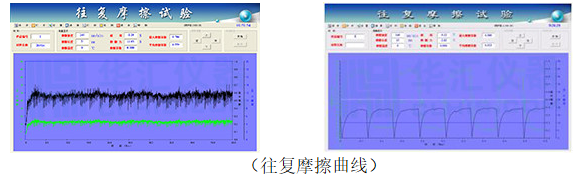往复摩擦试验模式:用来检测材料表面或涂层的摩擦系数和磨损率(耐磨强度)。运用球-盘、销-盘摩擦原理,将砝码或可变载入机构加至磨球上,材料试样随试验台以设定的速度、频率,实现动态加载或固定加载下摩擦副(点-面、线-面、面-面)的往复匀速直线运动,通过传感器获取摩擦时的摩擦力信号,经过计算机运算得到材料表面在特定条件(不同载荷、不同速度)下的摩擦系数曲线。
