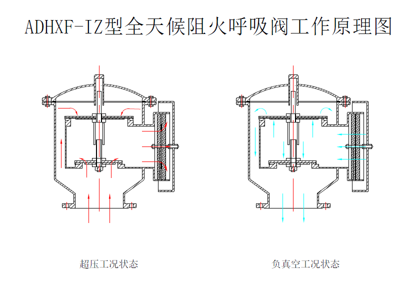 ADHXF-IZ型全天候阻火呼吸阀用于常压储罐内储存易燃易爆介质的工况,是集阻火器与全天候呼吸阀为一体的安全设施。