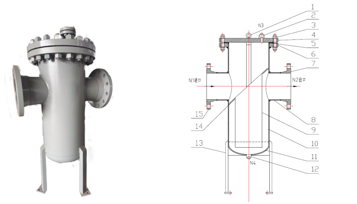 1、吊环;2、排气口;3、紧固件;4、筒体盲板;5、垫片;6、筒体法兰;7、出口法兰;8、进出口接管;9、滤篮;10、筒体;11、底部封头;12、放净口;13、支腿;14、斜度板;15、进口法兰;