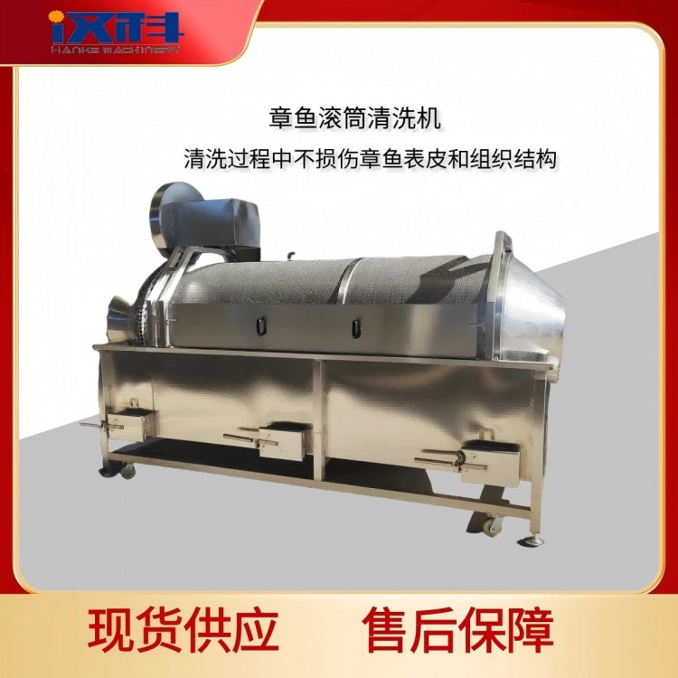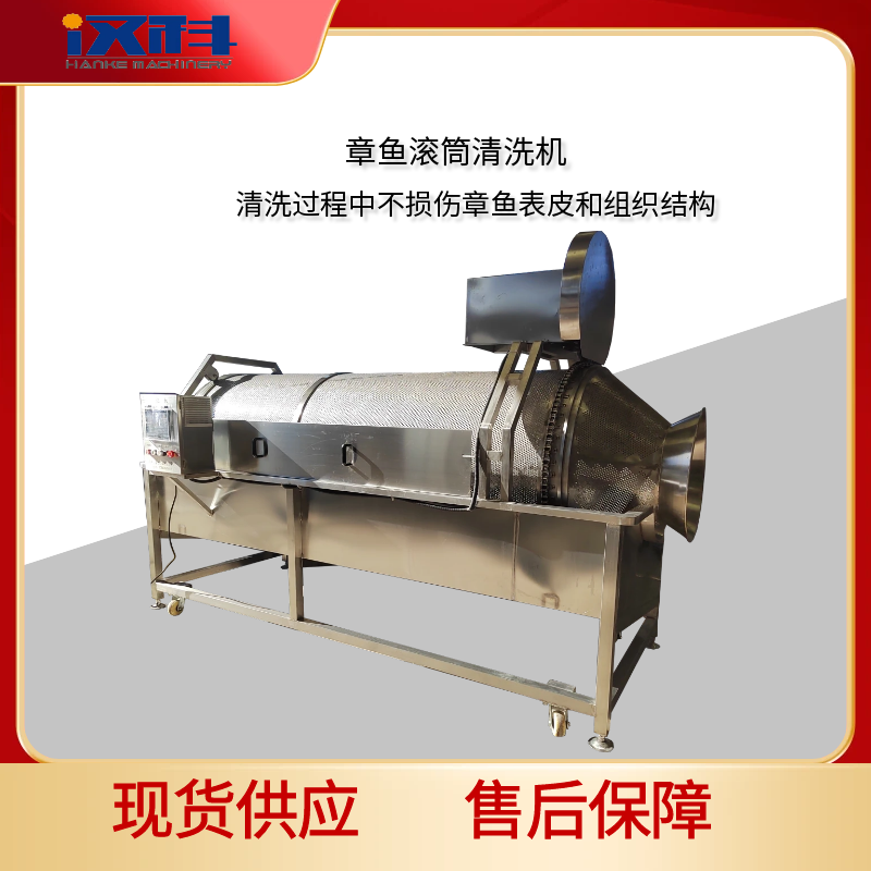 主清洗区为304不锈钢制成的筛网式滚筒,内壁设螺旋提升料环或圆弧形桨叶,推动章鱼翻滚并逐步前移。电机通过链条或齿轮带动滚筒旋转。料口设可拆卸的隔水挡板与过滤挡板。