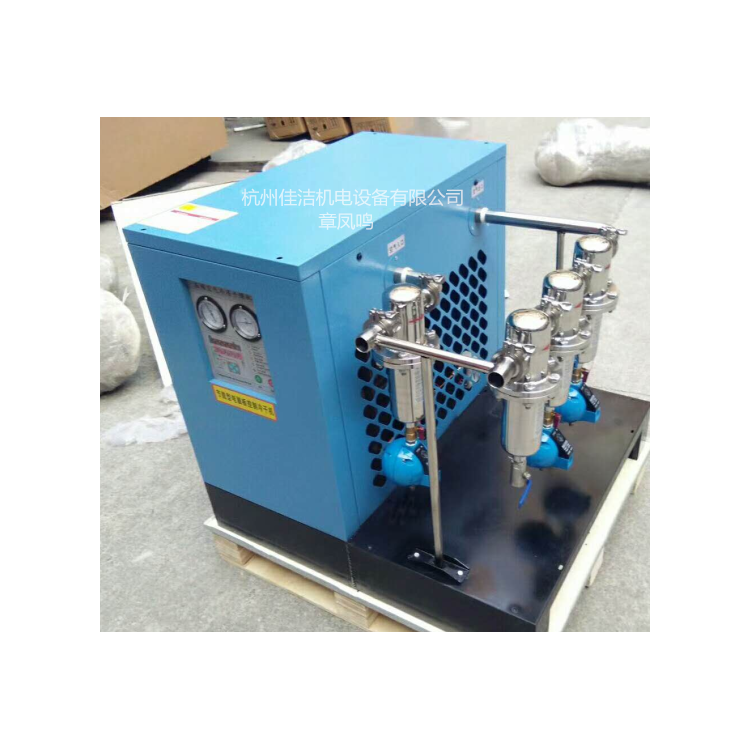工作原理:压缩空气中水蒸气的量是由压缩空气的温度决定的:在保持压缩空气压力基本不变的情况下,降低压缩空气的温度可减少压缩空气中的水蒸气含量,而多余的水蒸气会凝结成液体。冷冻式干燥机就是根据水的饱和蒸汽压力和温度之间的对应关系,l用制冷装置使压缩空气冷却到一定的l点温度,析出所含的水份,通过汽水分离器与电动排水器将水排出,从而使压缩空气得到干燥。