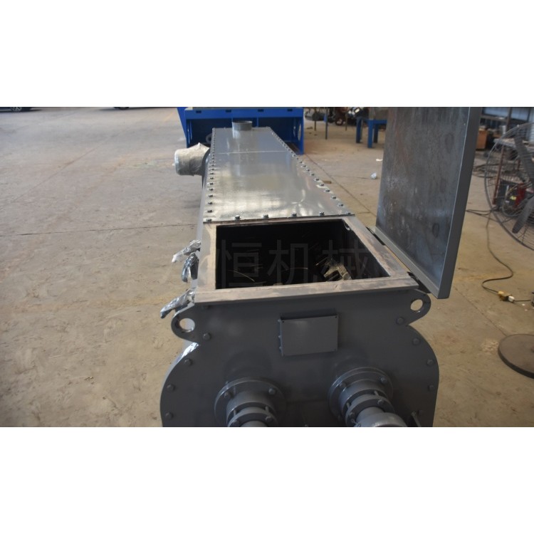 2.双轴搅拌器的驱动方式为链条带动,可通过介轮来调节链条的松紧程度,使运转平稳、安全可靠。