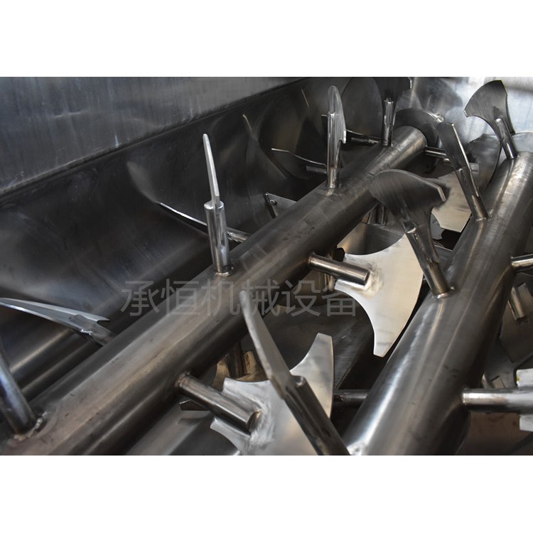 2.该机在w形的混合室内装有一对以相反方向旋转的轴,在每个轴上安装具有一定角度,一定数量目呈日委状的叶,在具有一走周速度的混合室内形成流动层,层内的物料在对流混合原理的作用下进行混合,并处于失重状态因