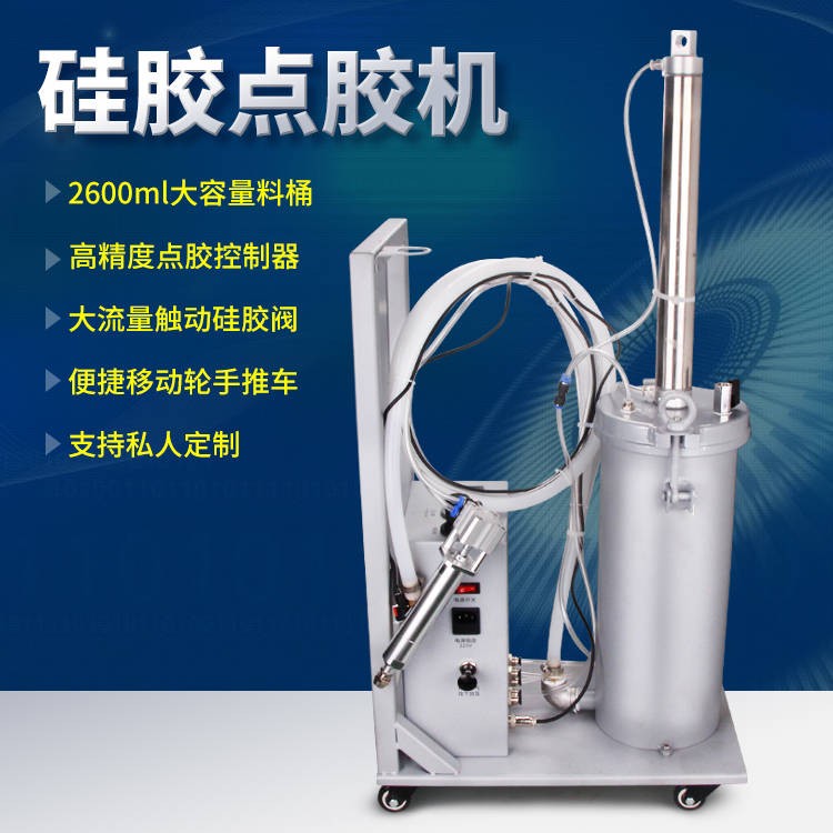 MY—2600毫升硅胶点胶机, 本机特点是可以满足生产流水线上的连续作业,更换胶水快速便捷,不浪费胶水,可节省大量人工费和胶水成本,整机设计小巧,操作维护简单;压力桶有无缝全碳钢和质密不锈钢两种,桶壁厚度大5~6mm,并加装防爆桶胶底座和外气缸,大幅度提升了压力容器的安全可靠性;机器配有自动泄压功能,当气压大于机器承压标准时,压力桶自动泄压,控制开关有手动或脚踏两种方式,操作起来十分简易,非常的人性化;有大量现货供应,欢迎咨询采购!