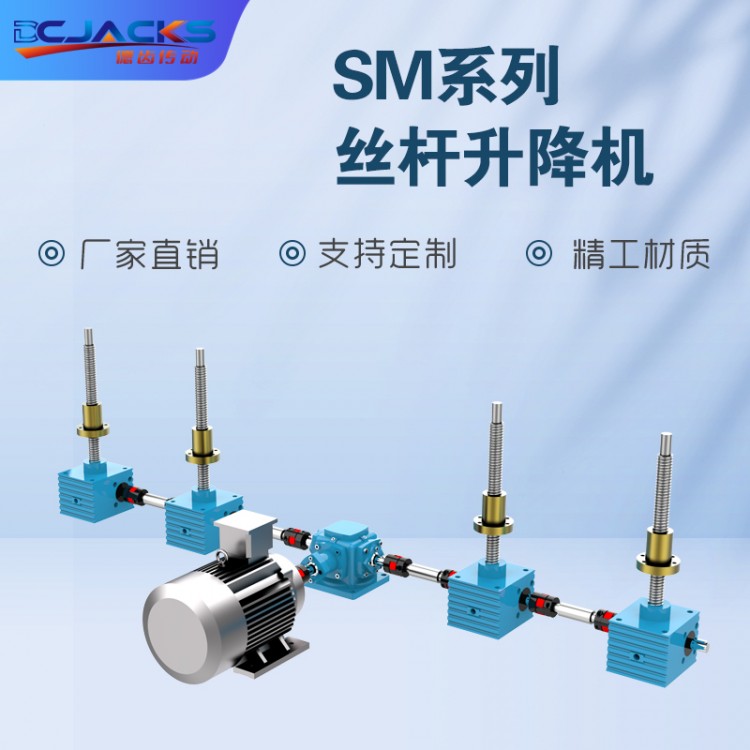 蜗轮丝杆升降机(螺旋升降机)是将电机,减速系统,丝杠传动等巧妙地组合在一起的机电一体化运动执行单元。它既可以单独使用,又可以多台组合,像拼积木似的通过直角转向器、联轴器和连接杆等联接件组合在一起并能按一定程序准确控制机构的升降、往复、翻转等运动。从而可以在多种场合取代传统的液压和气压传动,这种以蜗轮丝杆升降机为主的运动单元,为当今走人数字化时代的工程师们研发产品提供了广阔的设计空间。该系列螺旋升降机具有自锁性,采用独特的方形凹槽壳体,加大外壳的散热能力,延长润滑脂使用寿命等。球墨铸铁的外壳材料选择,大幅提高壳体的强度和性能,以及在高温/低温下的广泛应用。方形尾罩设计,控制丝杠不自转。先进的加工设备和加工组装工艺,是高产品质量的保证,先进的设计理念创造了抗冲击能力强,高强度,低噪音,长寿命,体积小的优质产品。被广泛应用于太阳能、冶金、食品、水利等多个行业。安全螺母设计,监测产品的磨损状况,消除隐患,与减速电机和各式附件模块组合,满足客户任意要求。