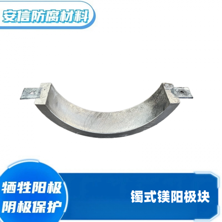 镁阳极有高驱动电压、低电流效率、造价高。根据形状以及电极电位(开路电位)的不同,镁阳极可用于电阻率在15欧姆·米到150欧姆·米的土壤或淡水环境。一般不应用于土壤电阻率小于10欧姆·米环境。高电位镁阳极的电位为-1.75V CSE,驱动电压0.85V;低电位镁阳极的电位为-1.55V CSE,驱动电压0.7V。使用温度可以达到100℃。当牺牲阳极剩余量为最初重量的15%,即认为阳极失效,所以,阳极的使用率一般取85%。