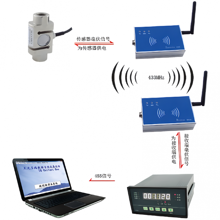 TW433型无线收发器,适用于模拟式传感器,作用是替代传感器的线缆来传输毫伏信号。TW433型无线收发器分为发射端和接收端,发射端和传感器连接,接收端和后端电气设备连接。发射端内置可充锂电池,可以给传感器供电。接收端不带电池,由后端电气设备为其供电。