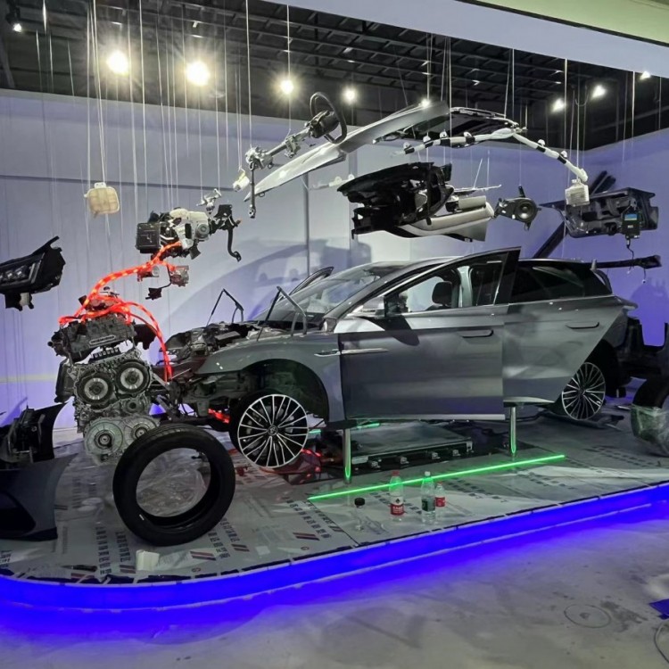 一、总体要求 汽车三维展示与教学平台通过汽车整车分解吊装展示及 相关教学平台,适用于高等职业院校和培训机构的汽车整 体构造与维修实训教学,能够满足对汽车整车结构、工作 原理的教学需要。 二、设计要求 1.采用整车解剖部件展示系统,基于对整车零部件的认知 设计而成,能清晰的展示了轿车的车架钣金结构; 2.真实展示汽车动力、传动、悬架、行驶、制动、转向、 电器组合部件、车身覆盖件等各个系统的布局; 3.真实展示发动机、电控系统的结构、组成与工作原理充 分展示出汽车各个零部件的全方位角度,使老师及学员对 汽车的每个系统能够充分认知及了解。 4.采用钢丝拉绳进行整车立体爆炸吊装,全面细致展示汽 车零部件在整车的安装位置,所有零部件吊装位置不得上 下、左右、前后颠倒。 5.把大件(如发动机、变速器等)分离出来,单独展开吊 装。 6.立体爆炸吊装模型施工不得破坏房屋原有结构,需采用 加强钢架结构,保证结构安全耐用 10 年。 7.对所选用的材料进行说明,包括钢架的钢材型号、钢丝 拉绳的规格等,阐述其满足承载能力和安全性的依据。