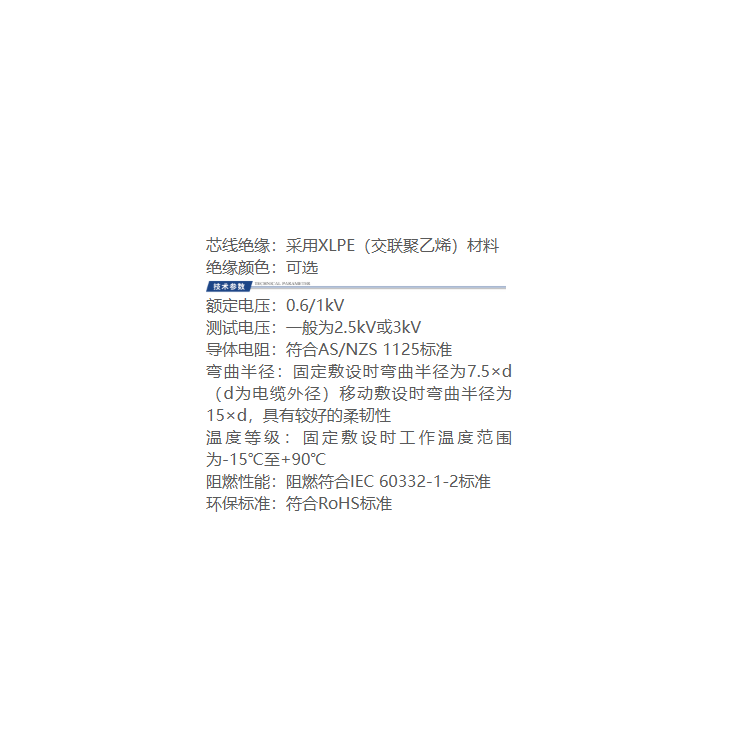 适用于电力设施中的电力、控制和连接电缆,可用于连接家用电器、工业设备、马达、开关和灯具等,可敷设于管道、直埋或安装于地下沟壑内。